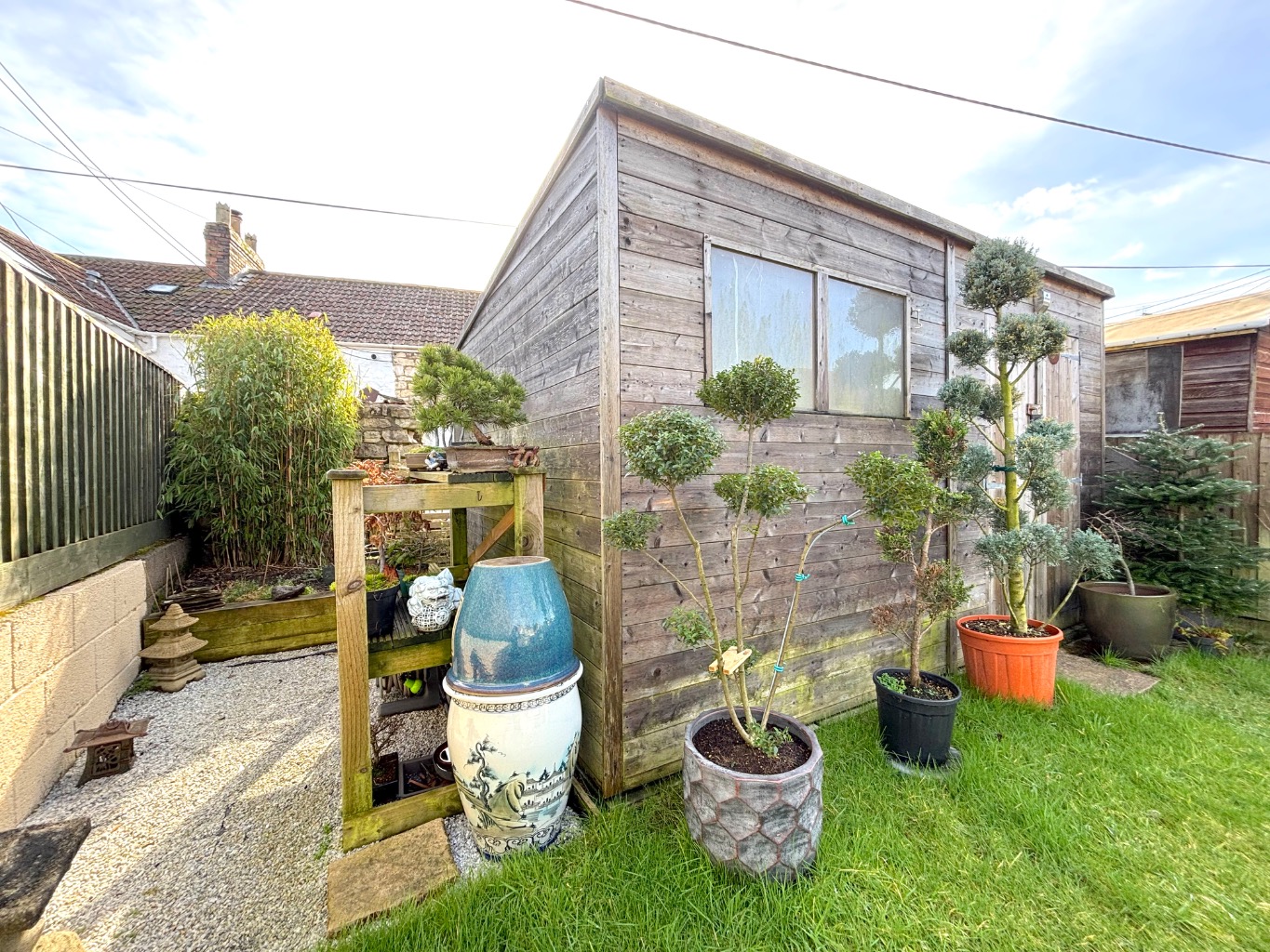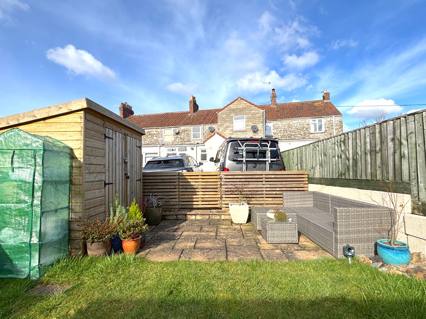 Enclosed rear garden with patio and shed