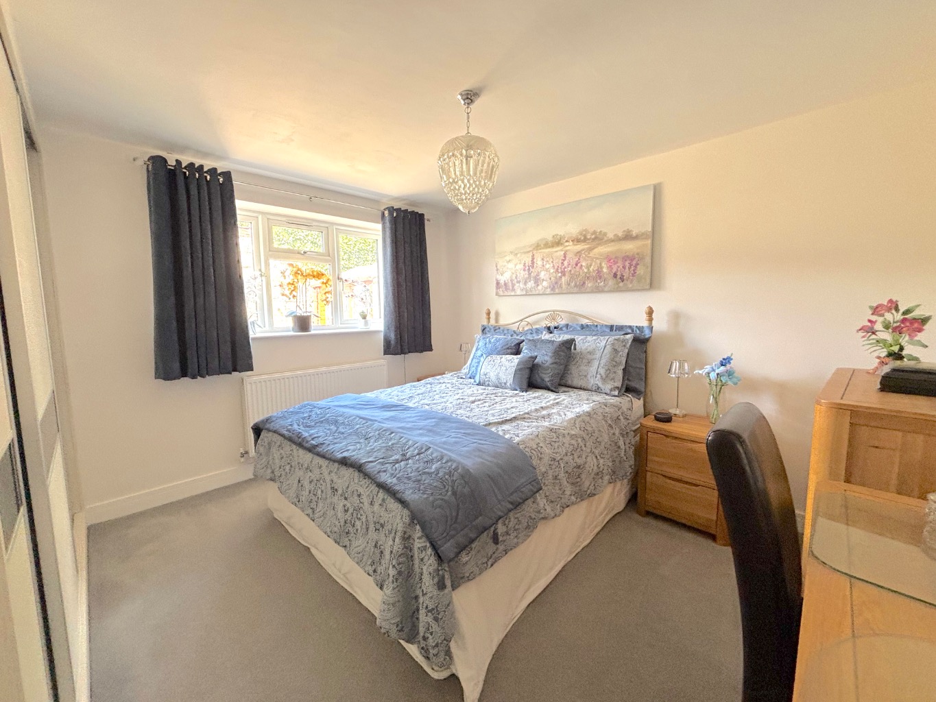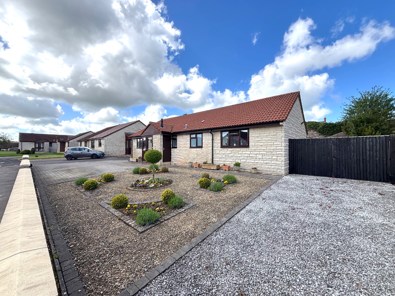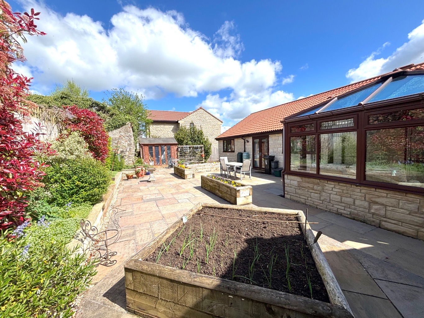 The sense of space continues externally. To the front, there is driveway parking alongside a single garage with power and lighting. Double width gates provide side access and additional parking when needed. The front garden is bright and inviting, with well stocked flower beds and planters creating an attractive approach.