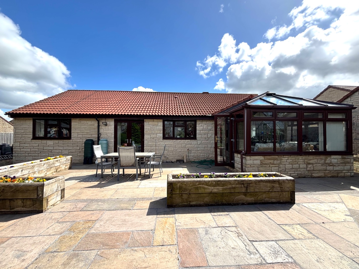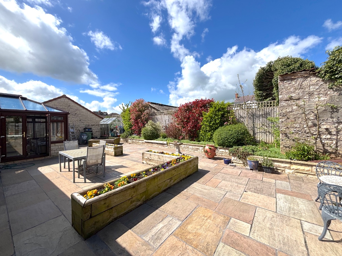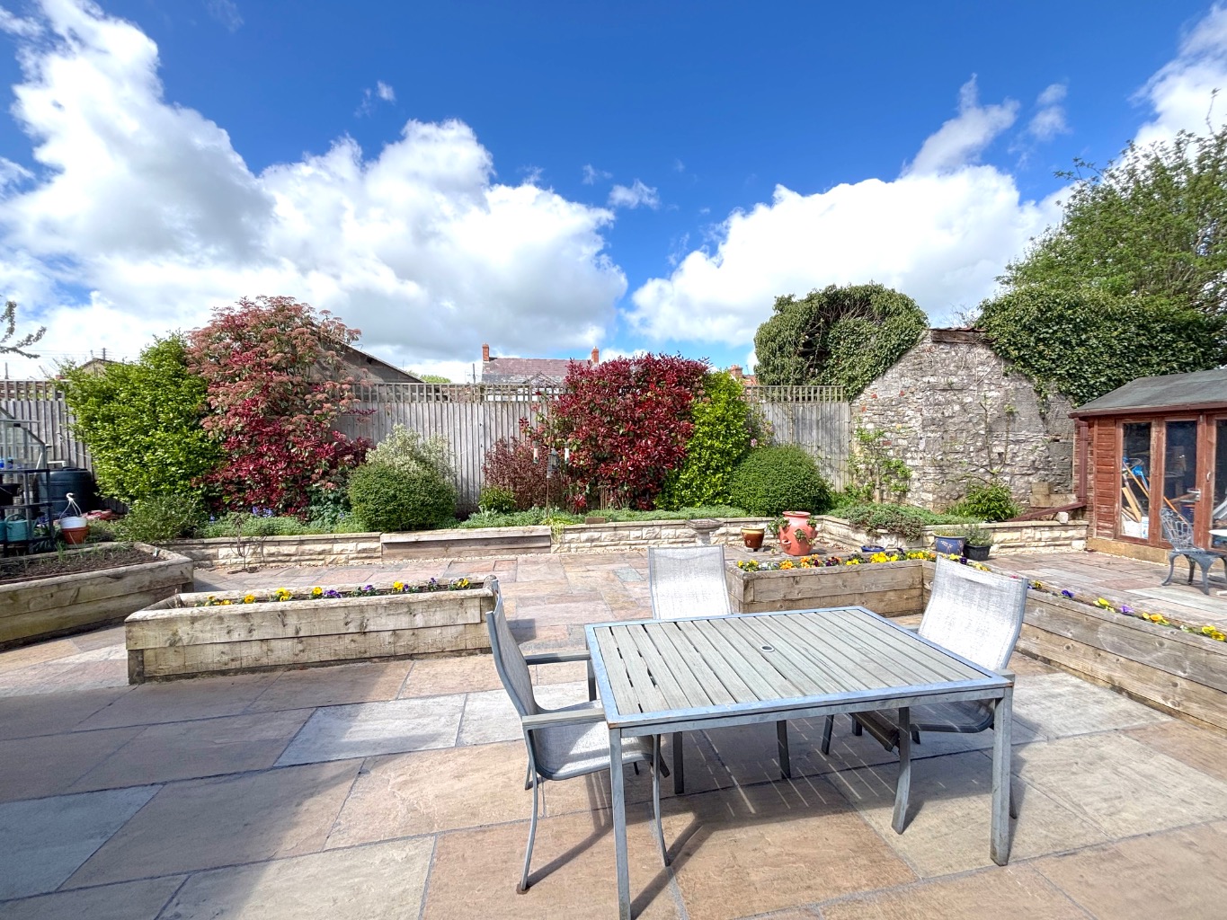 The rear garden is particularly generous and designed in a Mediterranean style with low maintenance in mind. It features paved patio areas, sections of hardstanding, and raised flower beds and borders. Enjoying a good degree of privacy, it offers an ideal setting to relax and make the most of the afternoon and evening sunshine.