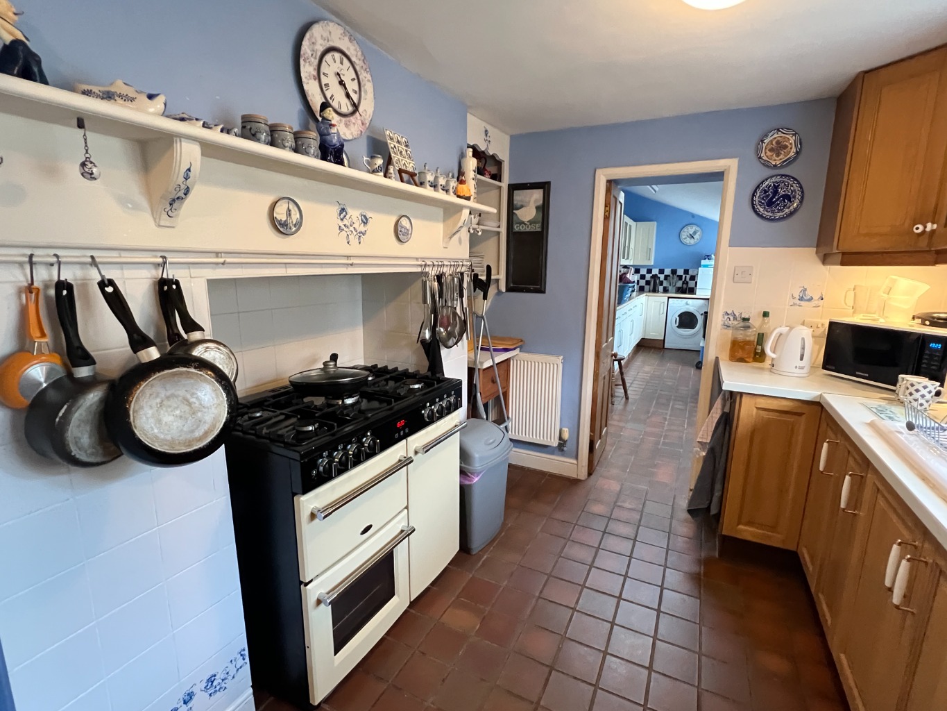 The kitchen offers plenty of storage space with a ceramic sink and drainer. There is space for a range cooker with tiled surround, as well as space for a fridge freezer. Doors lead through to the rear garden and into the utility room.