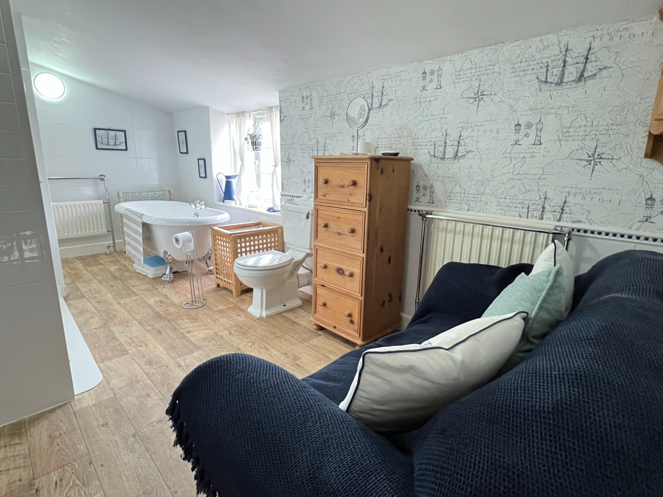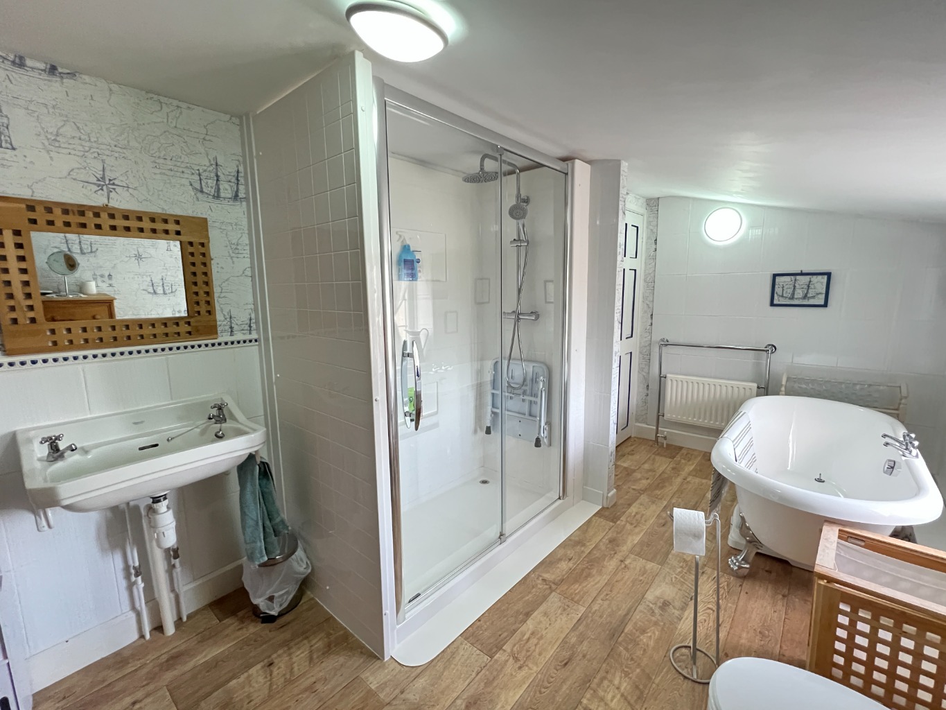 A truly stunning and spacious bathroom that is one of the standout features of this property. Beautifully appointed with a freestanding roll-top style bath, a large walk-in shower enclosure with rainfall head, wash hand basin and built-in storage cupboard. Finished with wood-effect flooring and part-tiled walls, this is a luxurious space that must be seen to be fully appreciated.