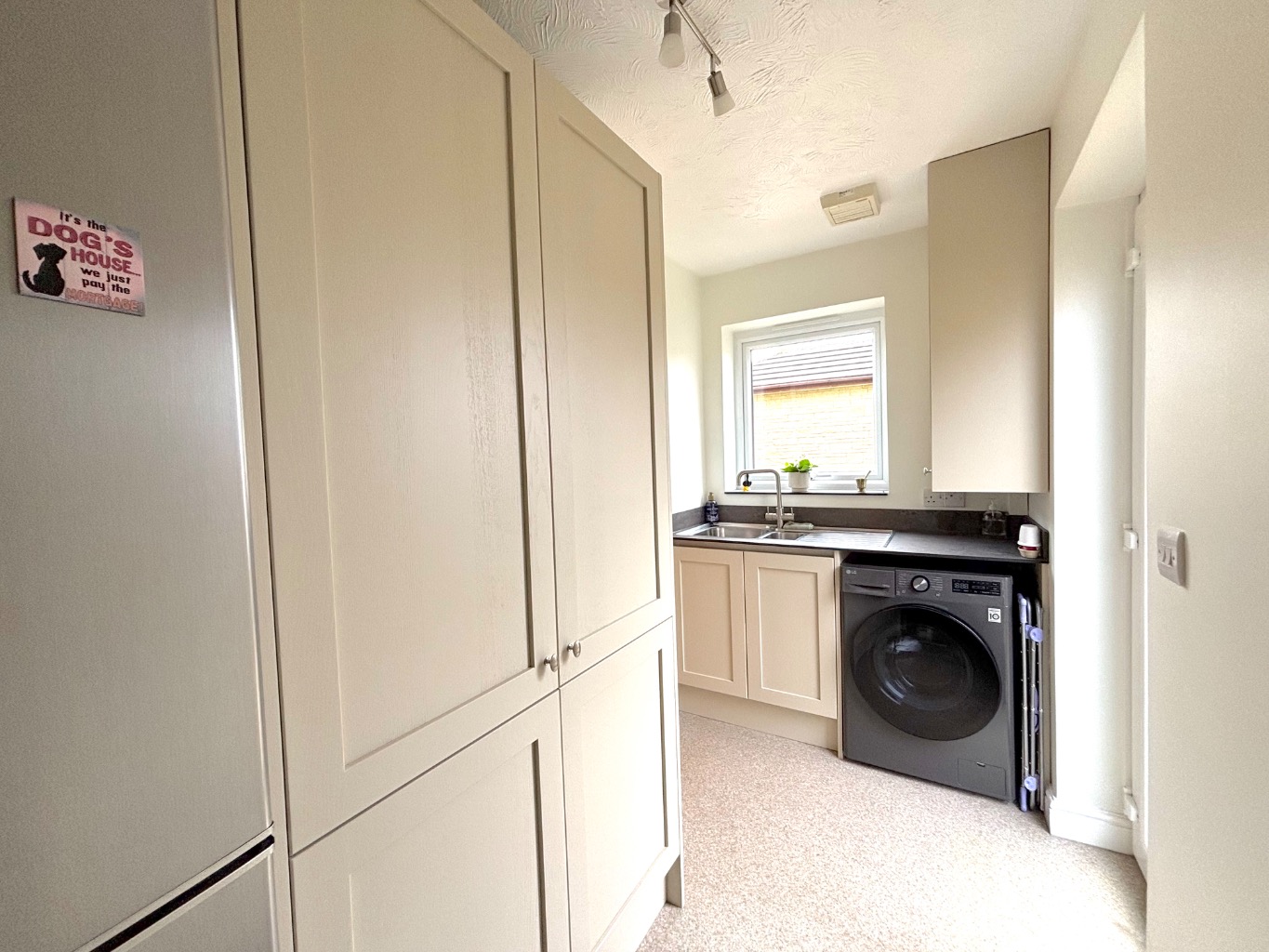 The heart of the home is the high-end kitchen, fitted with sleek modern units, excellent storage, and integrated NEFF appliances including double oven with a slide and hide oven and microwave oven as well as slimline dishwasher. Adjoining this is a matching utility room with sink, pantry-style cupboards, space for a fridge/freezer and washing machine, and housing for the recently installed 'Vaillant' boiler, with direct access to the garage. A large conservatory to the rear provides an additional versatile living space overlooking the garden. A ground-floor W/C completes this level.