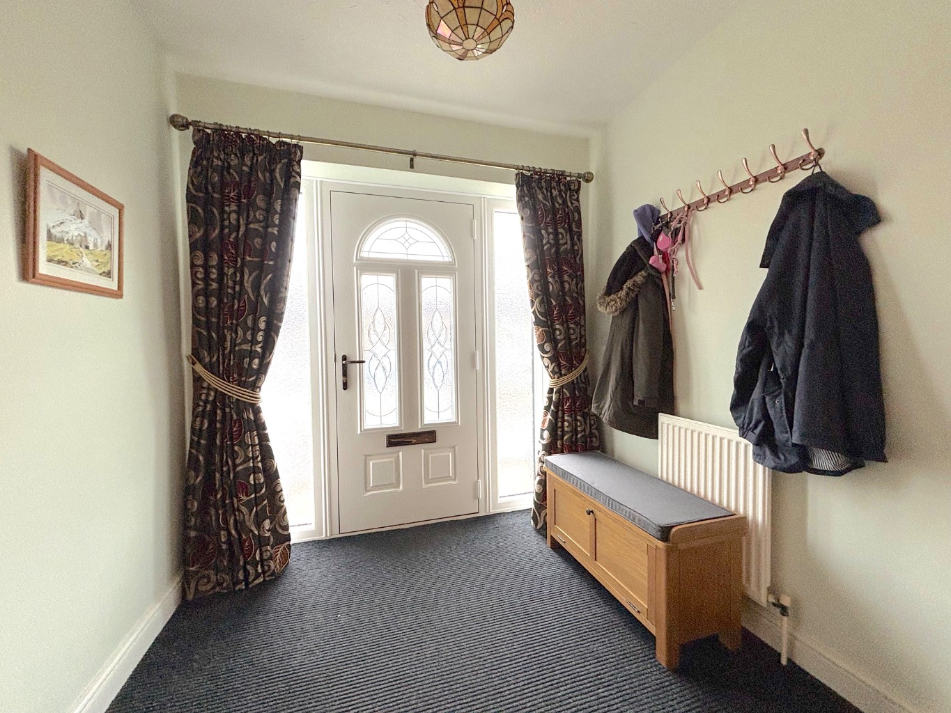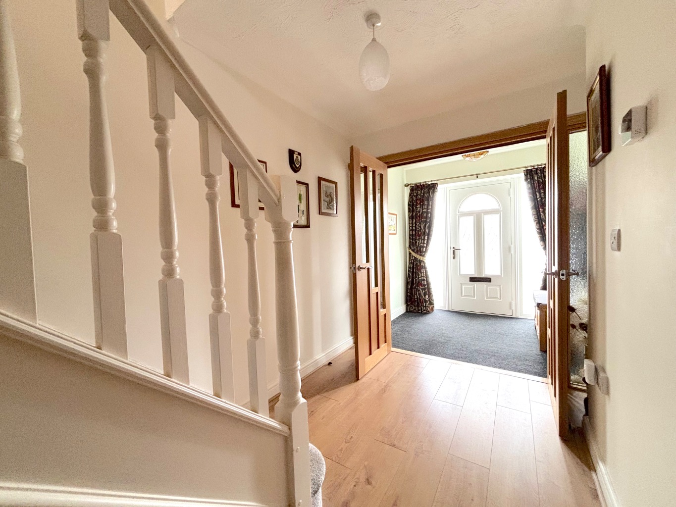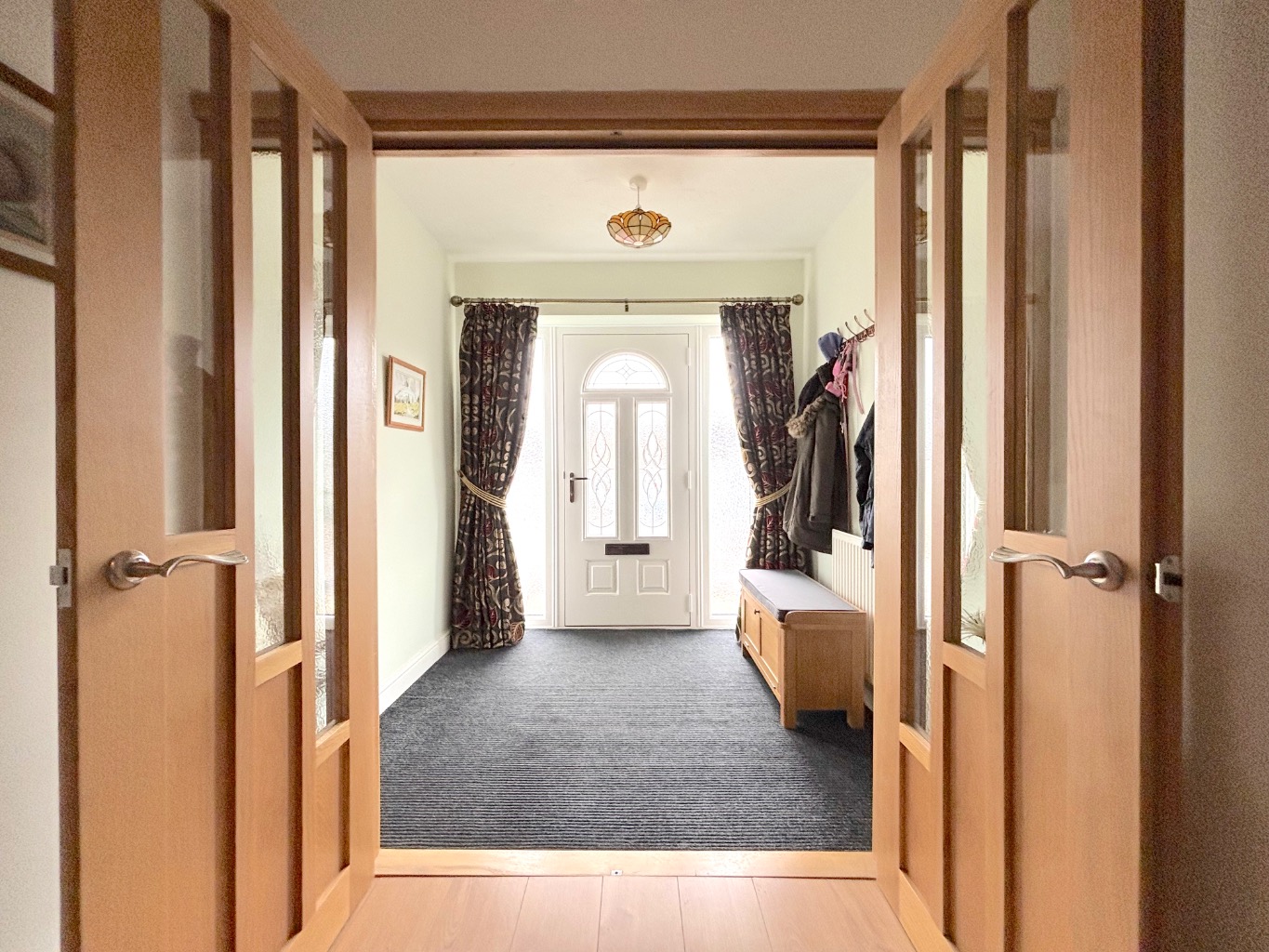 Stepping inside, a generous entrance vestibule provides useful space for coats and shoes before newly fitted double oak doors open into an inviting hallway with stairs rising, storage, and access to the principal rooms. The lounge is positioned to the front of the house and benefits from a bay window, creating a bright and spacious reception room that flows seamlessly into a formal dining area capable of accommodating a large table for family gatherings.