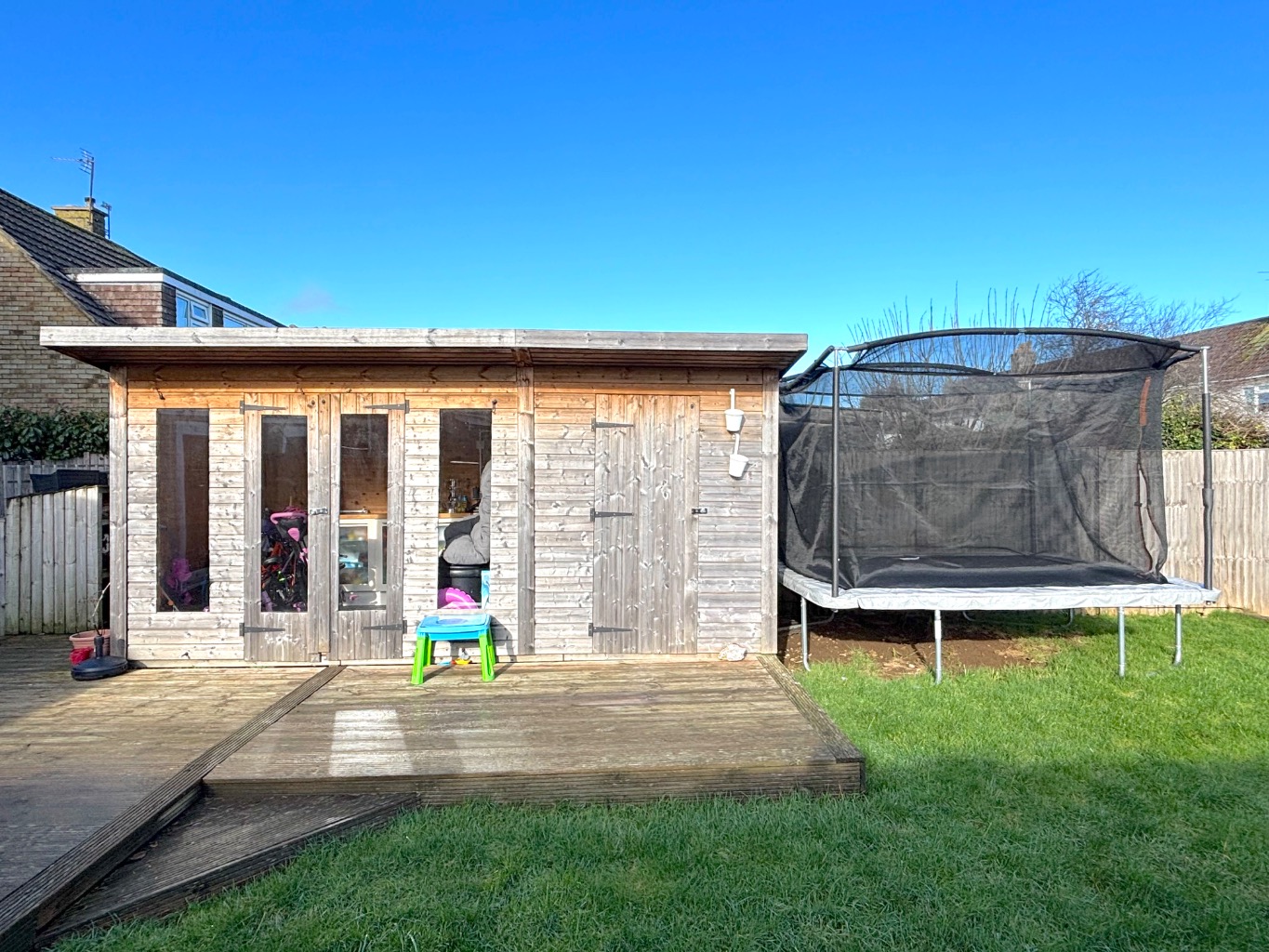 To the front, a private driveway provides off-road parking for up to three vehicles. The rear garden is generously sized and well maintained, laid mainly to lawn with a patio seating area and enclosed by timber fencing. A timber summerhouse with adjoining decking creates an excellent space for outdoor entertaining or relaxation.