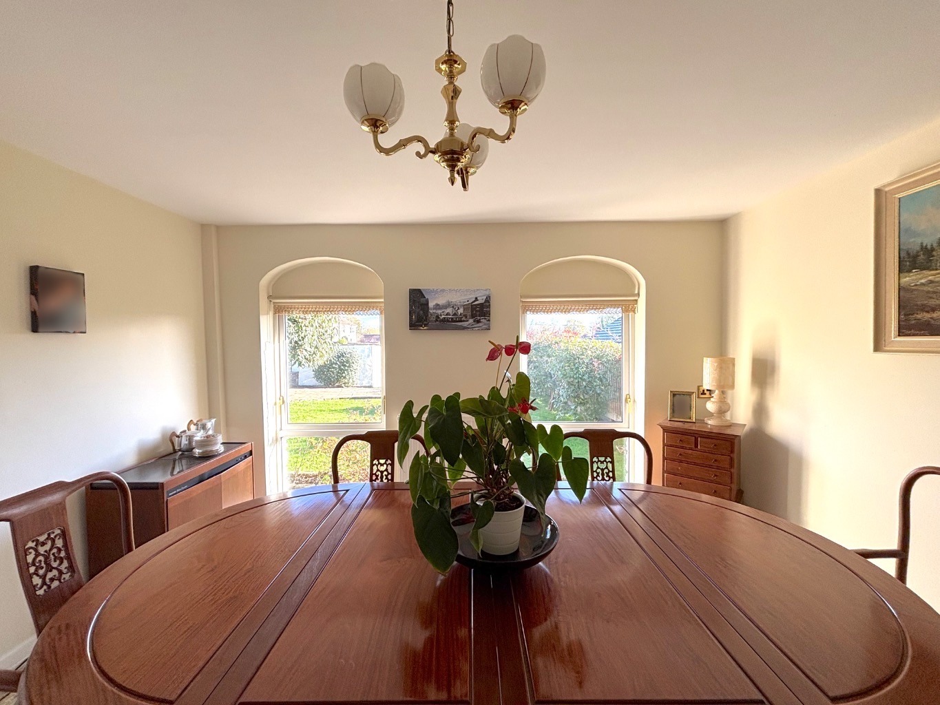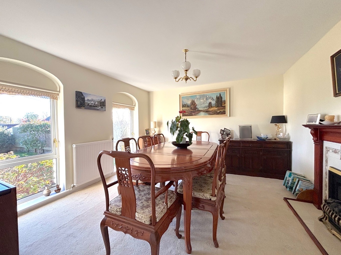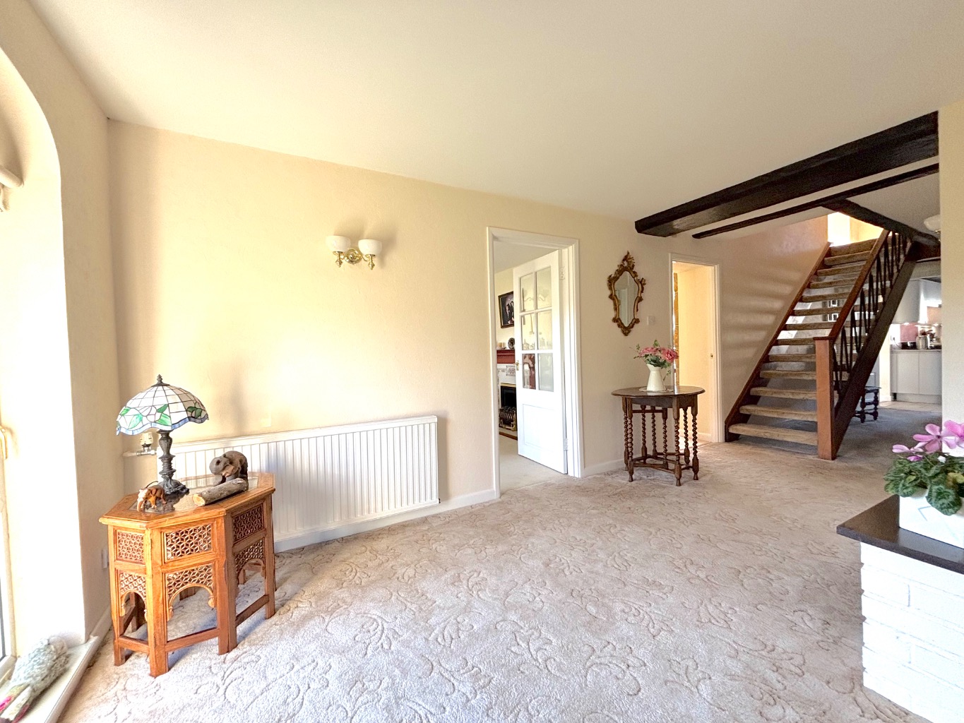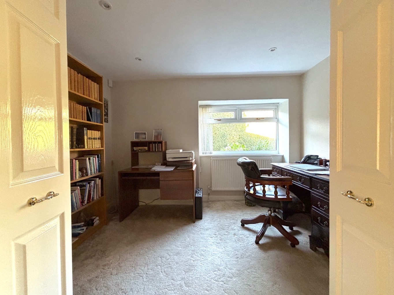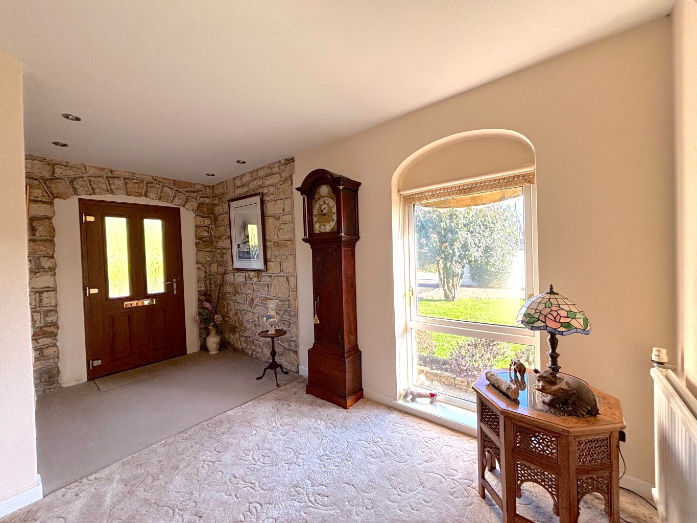 The accommodation is light, spacious, and welcoming, presented in a neutral décor throughout. A long entrance hall, enhanced by a striking full-height feature window overlooking the front garden, provides access to the first floor and a cloakroom featuring an exposed stone wall. From the hall, doors lead to a formal dining room, study, and a generous lounge with a wood burner fireplace and bay window. A garden room enjoys pleasant views across the rear garden and driveway, while the impressive kitchen/breakfast room is fitted with modern cabinetry, quartz work surfaces, integrated appliances, an Aga stove, and tiled flooring.