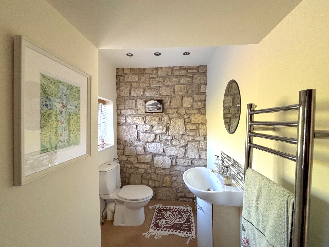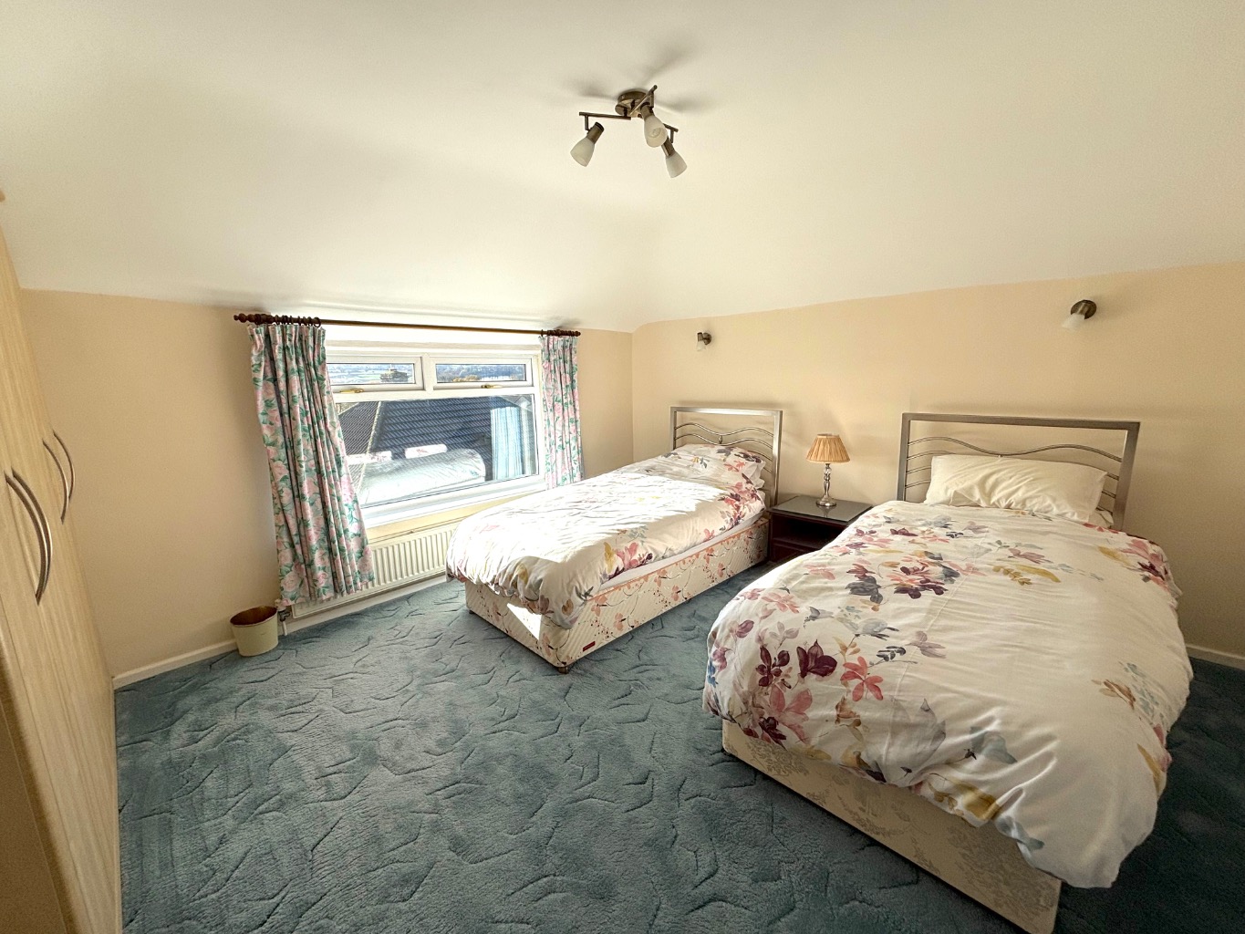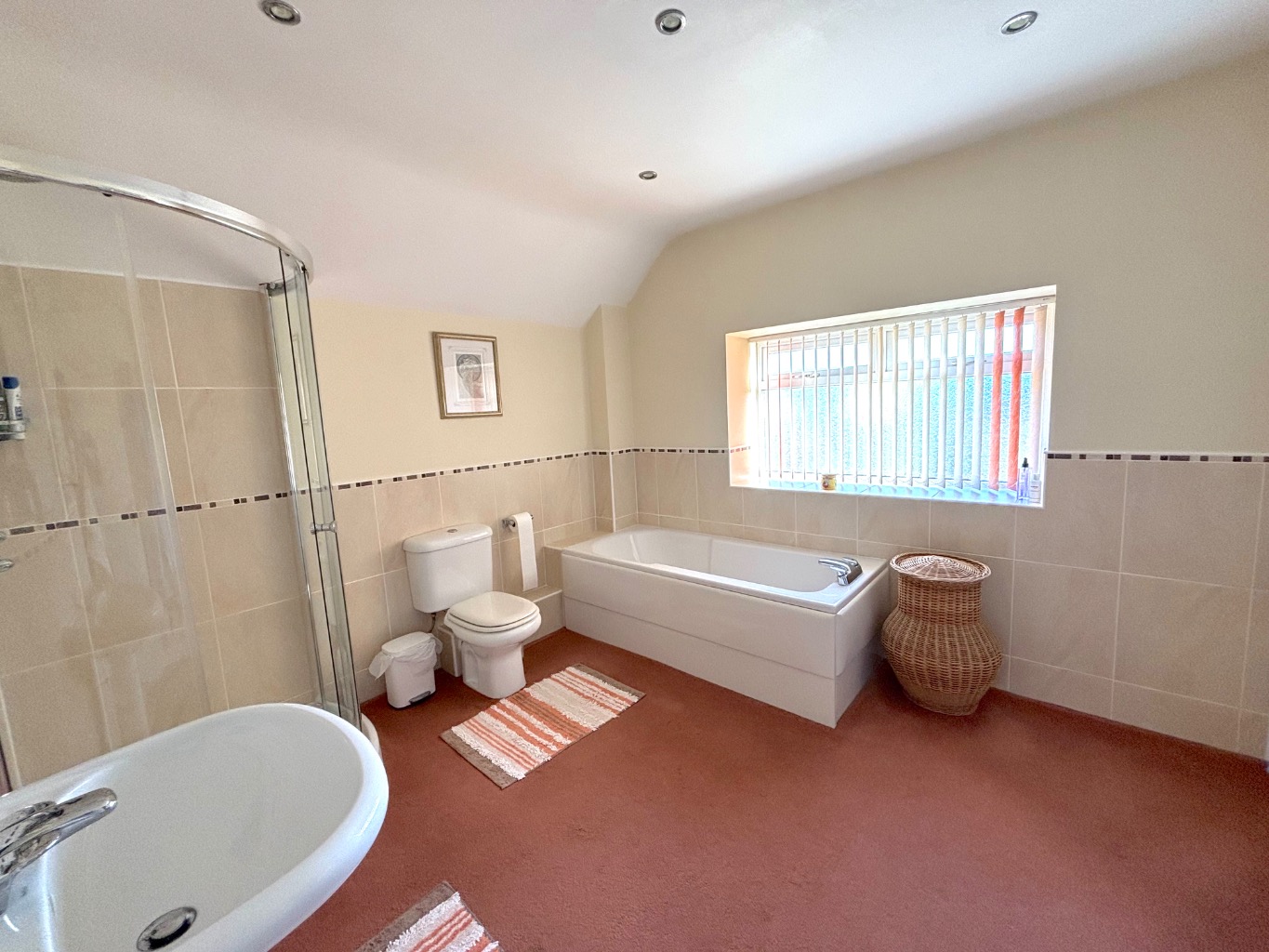 The first-floor landing leads to a well-appointed family bathroom conveniently offering both a bath and separate shower cubicle, serving three double bedrooms with built-in wardrobes and one single bedroom. The principal bedroom benefits from elevated views across the surrounding rooftops and countryside.