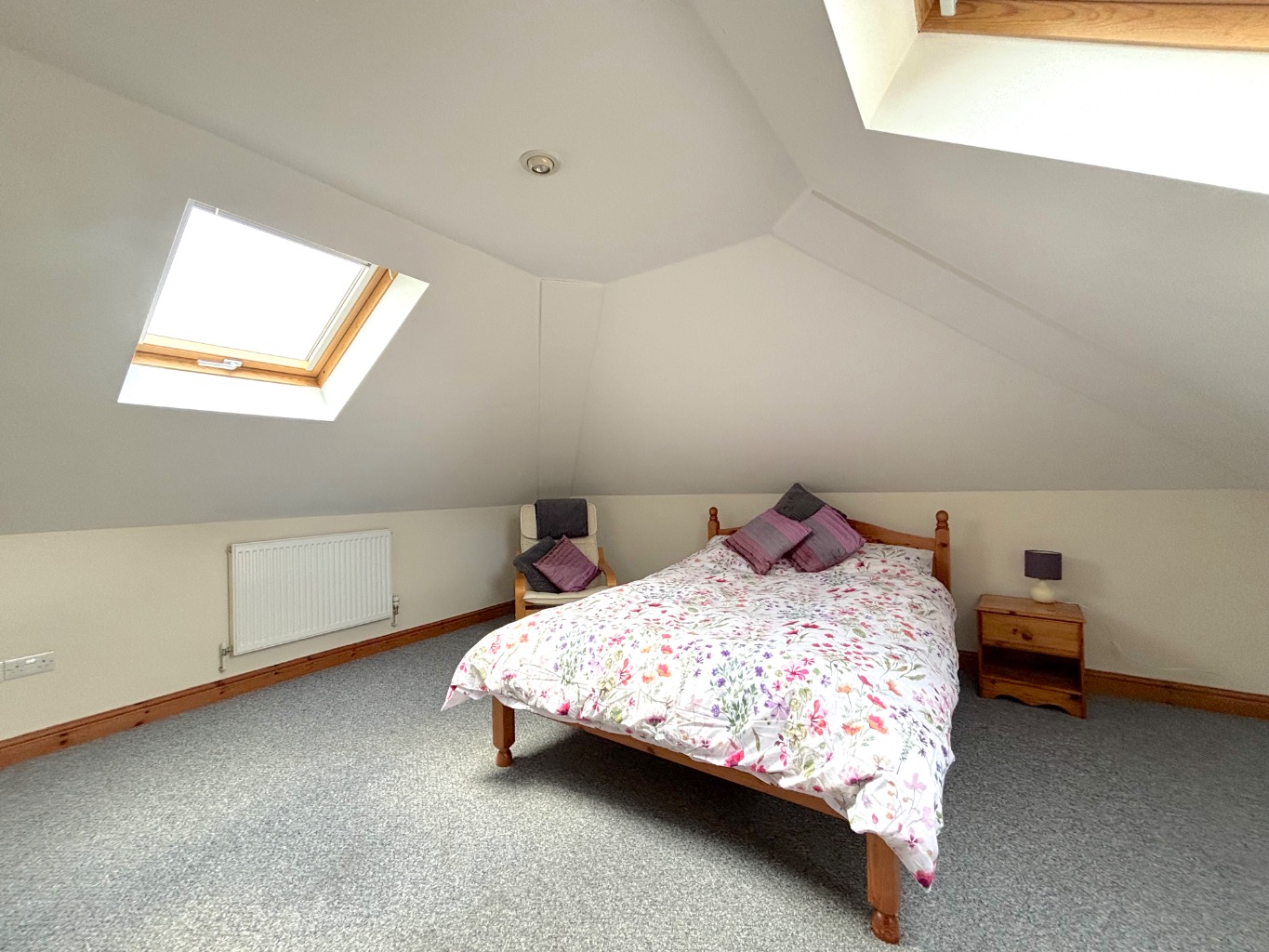 The open-plan reception room combines both dining and living areas, offering panoramic views of the surrounding countryside. The living room also features an open fire, creating a warm and inviting atmosphere. This light-filled space retains the original door to the property, leading to a second porch and out to the garden. The ground floor further accommodates three generous double bedrooms, all offering excellent proportions. Completing the ground-floor layout is a family bathroom with a panelled bath, WC, and wash basin, as well as a separate shower room with a walk-in shower, WC, and wash basin. On the first floor, the fourth bedroom offers a peaceful retreat, featuring two Velux windows that flood the room with natural light. Adjacent to the bedroom is a door leading to a partially boarded loft storage space.